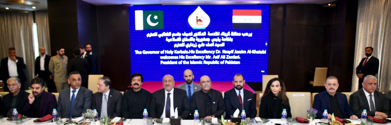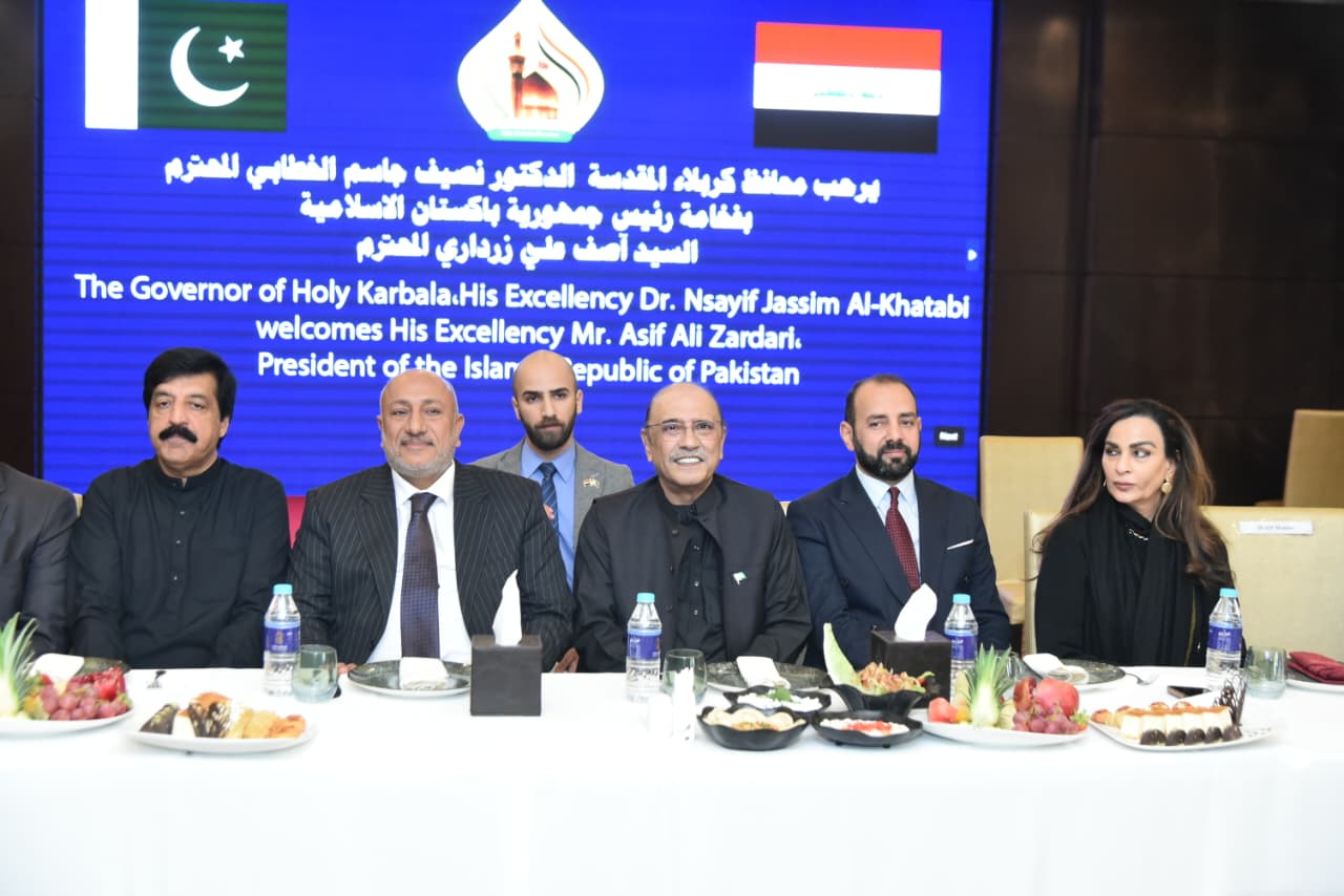 Karbala Iraq : President Asif Ali Zardari attended a luncheon hosted by Governor Dr Nassif Al-Khattabi. Talks covered cultural exchange, tourism promotion & preservation of historical sites. President expressed gratitude for the hospitality & underscored deepening Pakistan-Iraq ties.