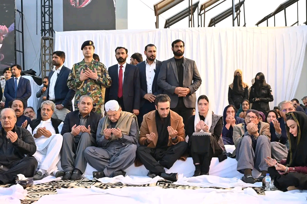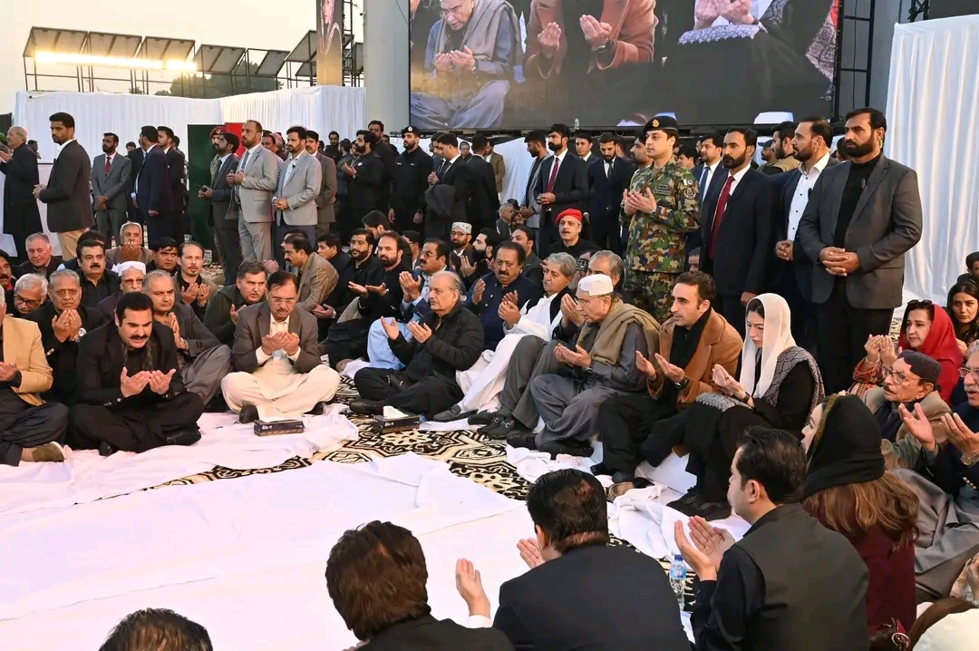 President Asif Ali Zardari, Chairman Pakistan Peoples Party Bilawal Bhutto Zardari, First Lady Bibi Aseefa Bhutto Zardari and other party leaders offering fateha on the martyrdom anniversary of Shaheed Mohtarma Benazir Bhutto.