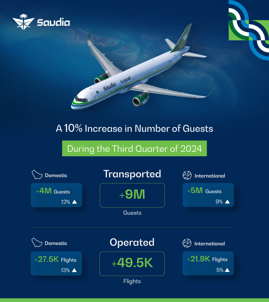 KARACHI(31st Oct. 2024) The national flag carrier of Saudi Arabia, has reported significant growth in its operational performance for the third quarter of 2024, as outlined in its latest performance report. The airline transported over nine million guests, marking a 10% increase compared to the same period in 2023. This achievement was supported by more than 49,500 flights, reflecting a 9% increase in flight operations. Additionally, Saudia logged 146,700 flight hours, representing an 11% increase over last year, with an impressive on-time performance rate of 87.8%.