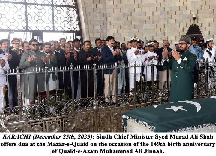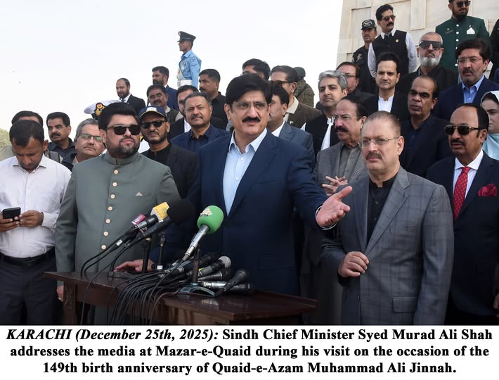 KARACHI (December 25th, 2025): Sindh Chief Minister Syed Murad Ali Shah addresses the media at Mazar-e-Quaid during his visit on the occasion of the 149th birth anniversary of Quaid-e-Azam Muhammad Ali Jinnah.