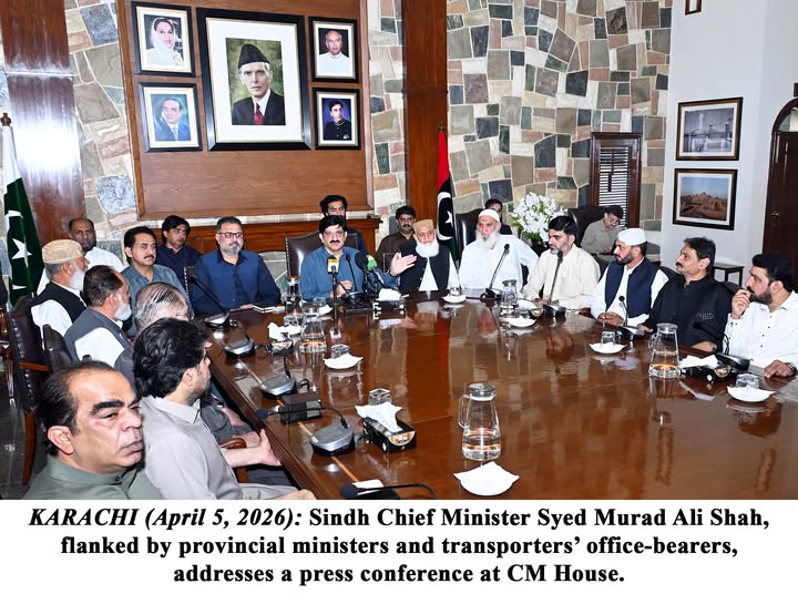 KARACHI : Sindh Chief Minister Syed Murad Ali Shah, flanked by provincial ministers and transporters’ office-bearers, addresses a press conference at CM House.