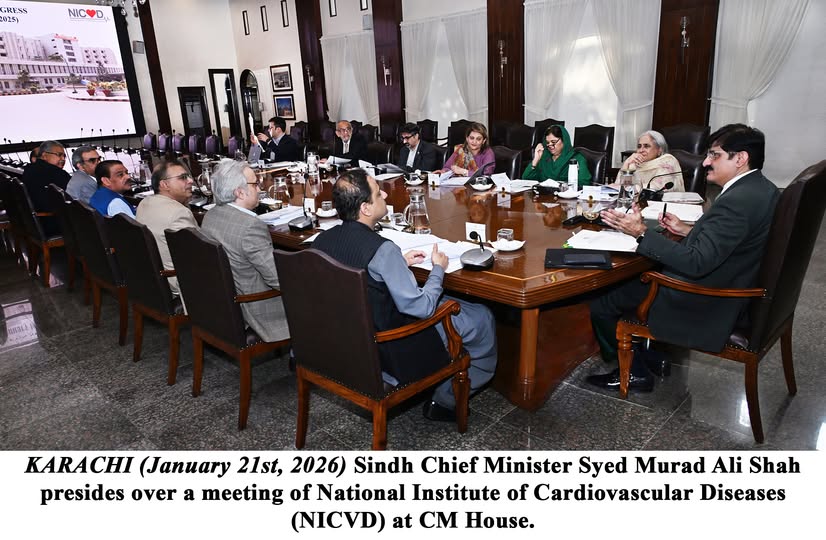 KARACHI (January 21st, 2026) Sindh Chief Minister Syed Murad Ali Shah presides over a meeting of National Institute of Cardiovascular Diseases (NICVD) at CM House.