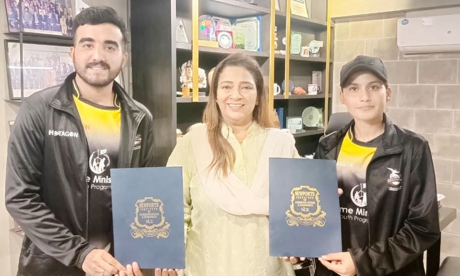 Karachi (Staff Reporter): Newports Institute of Communication and Economics has announced a 100% scholarship for Syed Zain-ul-Abidin and Amna Zahid in recognition of their selection in the Lahore Qalandars Prime Minister’s Youth Program. Rector Madam Huma Bukhari presented the full scholarships to the students.