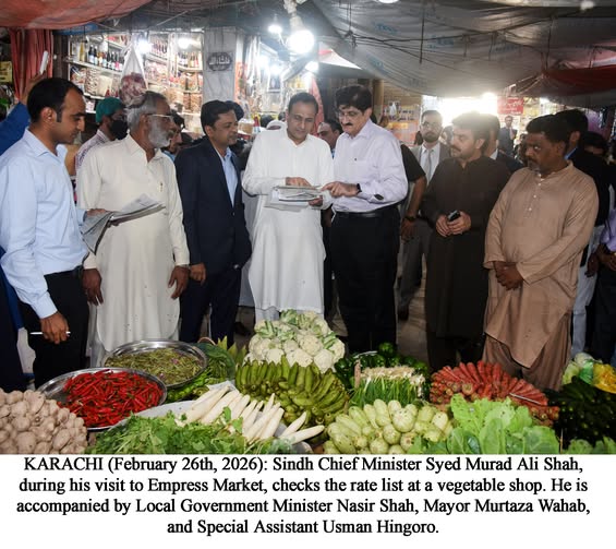 KARACHI (February 26th, 2026): Sindh Chief Minister Syed Murad Ali Shah, during his visit to Empress Market, checks the rate list at a vegetable shop. He is accompanied by Local Government Minister Nasir Shah, Mayor Murtaza Wahab, and Special Assistant Usman Hingoro.
