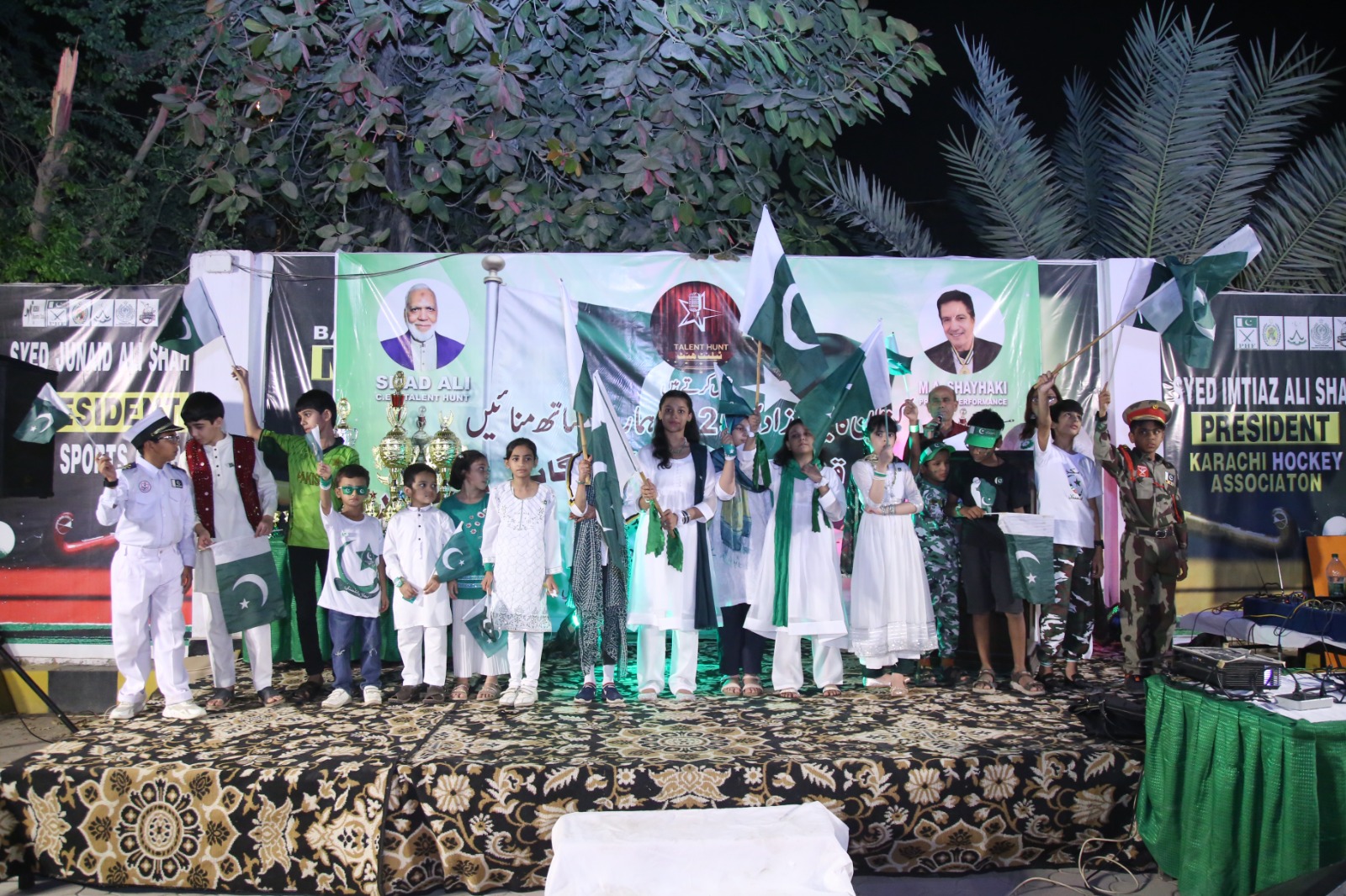 Karachi : Talent hunt presented Jashan e Azadi at KHA Hockey Stadium organized by Shad Ali along with M A Shehki (Judge), Imran (Judge),M Ifraheem, Ustaad Salamat Ali, poet Khalid Irfan,Gulfaraz Ahmed Khan Vice president Sindh hockey Olympic Association, Hanif Khan Olympian,Junaid Ahmed Khan President All Palistan Media Alliance and Haider Ali secretary general KHA.
