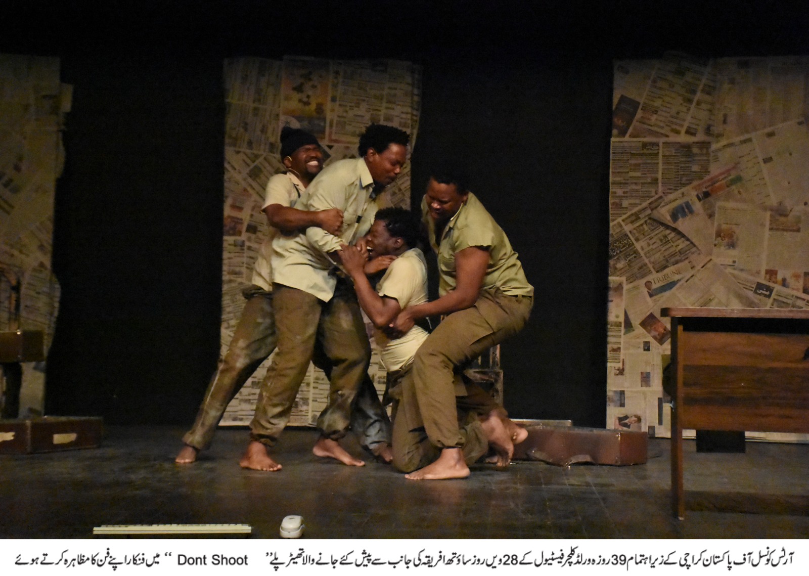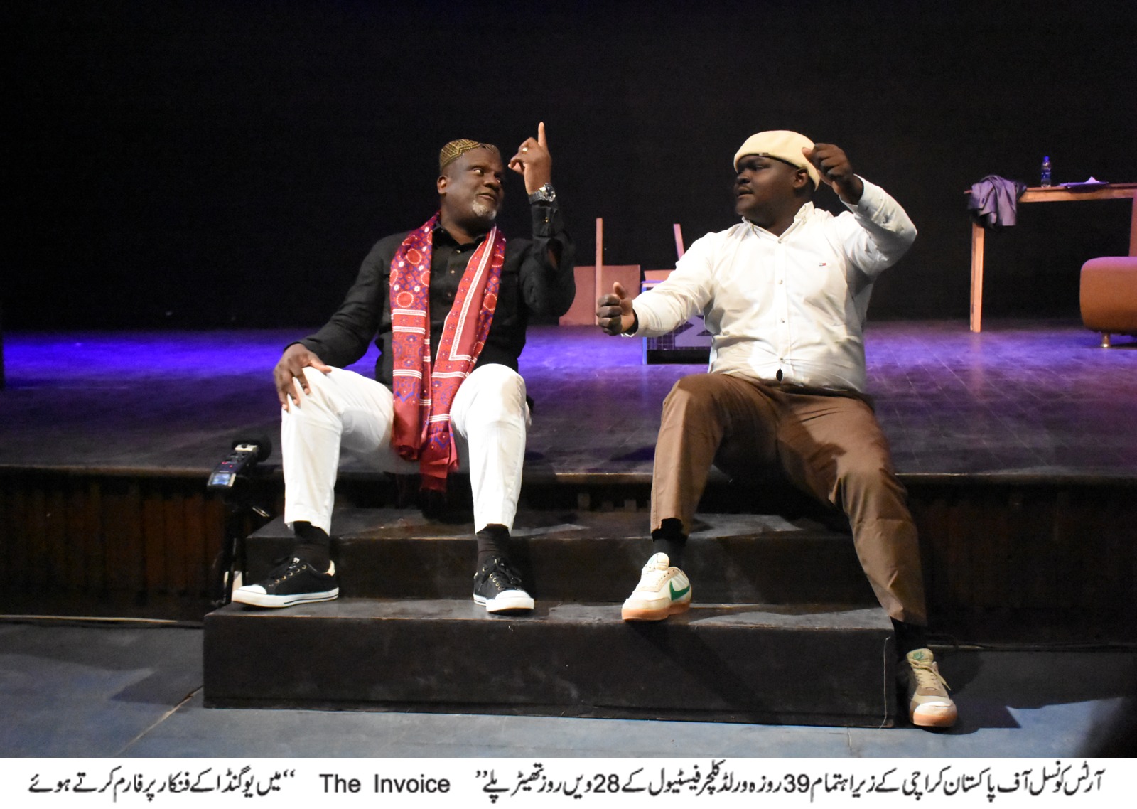 He added that the Arts Council deserves a place in the Guinness Book of World Records and that Ahmed Shah should be nominated. President Arts Council Muhammad Ahmed Shah said that artists from all fields—painters, musicians, actors, and singers—are participating in the World Culture Festival. “There is no other festival in the world that brings together experts from five disciplines. This is the longest global cultural gathering. We believe in equality. I oppose armed revolutions; culture is the greatest weapon of revolution. Artists across the world are protesting injustices through their performances.” He added that the festival is unique because it is entirely managed by artists themselves, most of whom travelled on their own expenses. “More than 80% of the participants came on self-funded tickets. The Government of Sindh is offering complete support, from guest arrivals to their city tours. Our students are doing tremendous work, and the commitment of our youth is admirable.” Renowned artist Shahid Rassam said that Peace & Pieces is an international-level exhibition, and this is the fifth edition, showcasing the work of 21 artists. Artist Muhammad Zeeshan said, “There is no greater joy than seeing the plant you nurtured bear fruit. I am proud to be associated with an institution like the Arts Council.” From South Africa, the theatre play “Don’t Shoot” was presented, directed, and written by Busisiwe Mazibuko, featuring actors Siyabonga Benjamin, Junior Gcwensa, Pakiso Mokoena, Gladys Busisiwe Mazibuko, Thapelo Roland Mogasho, Phetho John Motshabi, and Vuyisile Donald Mowashu. The play followed the powerful journey of four men who escape a brutal political detention camp, facing difficult and life-changing choices along the way. The day concluded with the Ugandan play “The Invoice,” directed by Philip Luswata. Performers Keith Divine, Walter Asiku, Juma Kayondo, Shanitah Akandinda, and Viola Najjuko captivated the audience with their stellar performances. The play humorously depicted African artists’ struggle to reclaim their creative freedom, receiving thunderous applause from the audience.