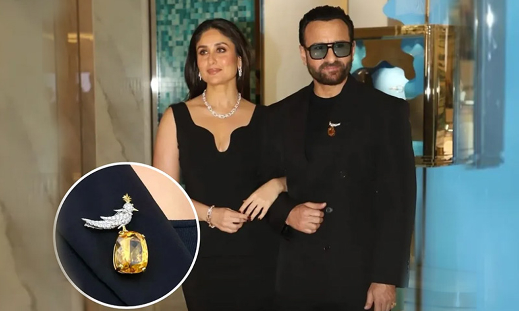 INDIA : Bollywood’s famous actor Saif Ali Khan is once again in the news, but this time the reason is not his film or style, but his precious ruby-diamond brooch. According to Indian media, Saif Ali Khan and his wife Kareena Kapoor Khan were spotted at the boutique of renowned jewelry brand Tiffany & Co. in Mumbai ahead of Valentine’s Day. While stepping out, Saif Ali Khan wore a unique brooch with a beautiful black suit, which immediately caught everyone’s attention. This brooch is designed in the shape of a bird and is made of gold, platinum, 71 round diamonds, a ruby, and a cushion-cut sapphire, making it not only precious but also rare. According to media reports, the price of this brooch is approximately 47,000 US dollars, which is equivalent to approximately 4.2 million rupees in the Pakistani market, which has surprised fans and fashion enthusiasts. He was joined by Kareena Kapoor Khan at the event, who donned a beautiful black dress and accessorized her stunning figure with diamonds. The two were absolutely dazzling together with their style, sophistication, and class, and their presence added to the glamour of the event.