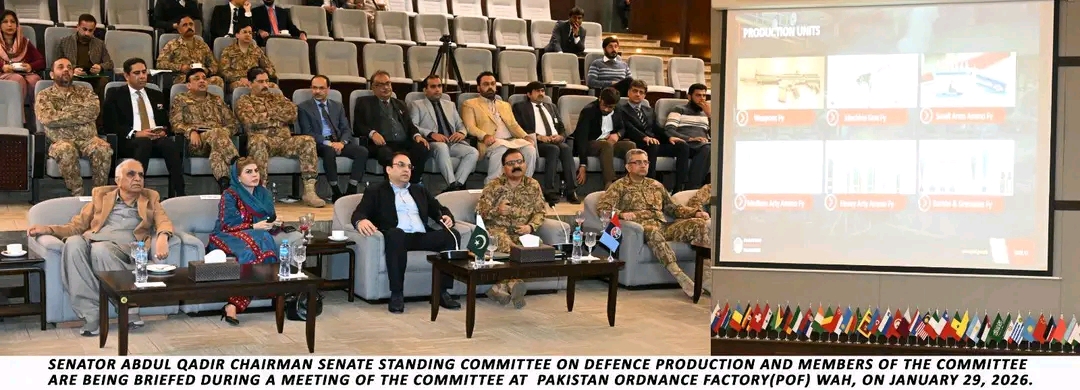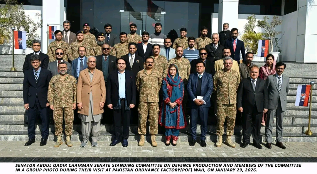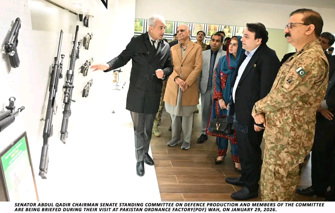 The Senate Standing Committee on Defence Production visited Pakistan Ordnance Factories (POF), Wah Cantt, under the Chairmanship of Senator Mohammed Abdul Qadir to receive a comprehensive briefing on the functions, performance, ongoing projects, Vision 2025 strategic objectives, BMR (Balancing, Modernization and Replacement) plan, and export earnings over the last five years. Members of the Committee, Senator Dost Ali Jeesar and Senator Samina Mumtaz Zehri, were also part of the visiting parliamentary delegation.
