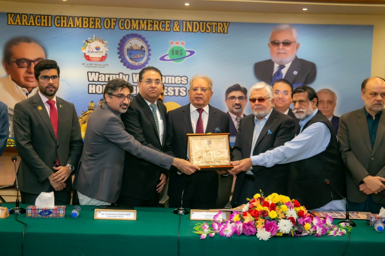 Former Chairman Senate of Pakistan Mohammad Mian Soomro, Chairman Businessmen Group Zubair Motiwala, President KCCI Muhammad Rehan Hanif, Senior Vice President Muhammad Raza, Senior Vice President REAP Jawed Jilani, Former Chairman REAP Abdul Qayyum Paracha, Former President Junaid Esmail Makda, KCCI Executive Committee Members.