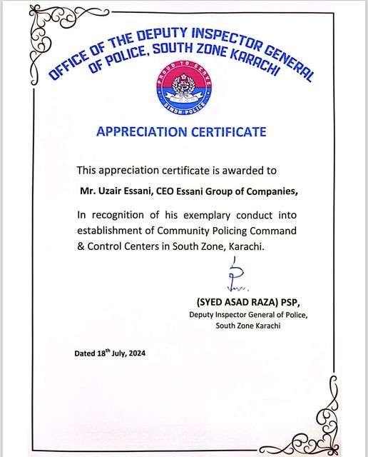 Karachi: Muhammad Uzair Essani was honored with a token of appreciation by Mr. Asad Raza, Deputy Inspector General of Police South Zone, for his substantial contributions to a collaborative effort between Karachi Police and the Karachi Business Forum (KBF). This joint venture aims to enhance the city’s infrastructure and safety measures. The initiative includes the implementation of advanced technologies, community engagement programs, and strategic policing methods to ensure the safety and well-being of Karachi’s residents. The partnership underscores a commitment to making Karachi a safer and more secure place for all.
