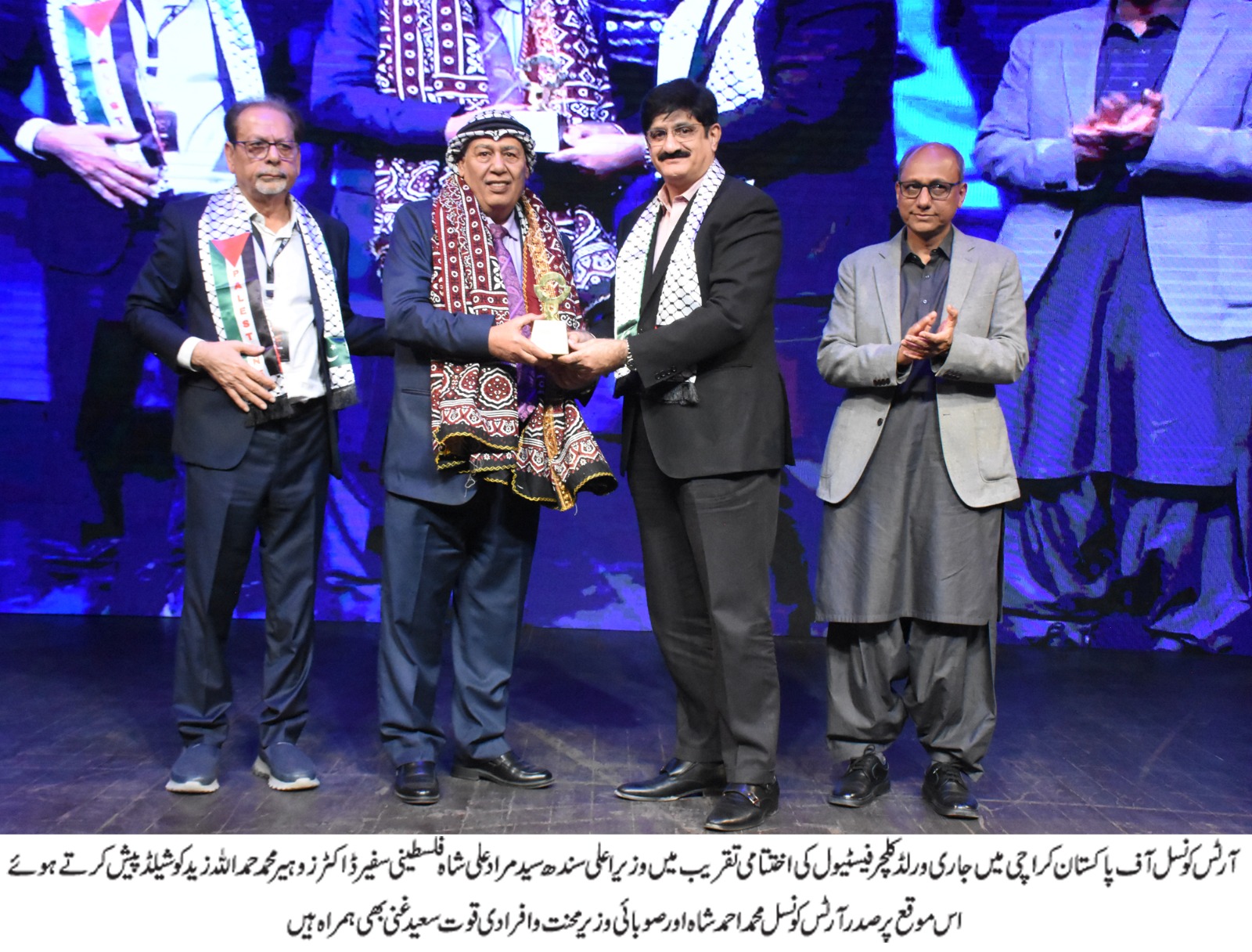 I thank all artists from around the world. Do not harm others for your happiness.”In his welcome address, President Arts Council Muhmmad Ahmed Shah thanked Chief Minister Sindh, ministers, diplomats, ambassadors, Sindh officials, Sindh Police and international artists. He acknowledged the continuous support of the Sindh government and security agencies, saying that more than 80% of international artists came at their own expense.He said, “Last year we had participation from 44 countries, this year artists came from all over the world. Our team, students and volunteers worked day and night without breaks. Next year we will host an even bigger festival. More than 1,000 Pakistani artists participated. The global community is aware of women’s issues, child exploitation and genocide. We want peace and raise our voice through art.”He said, “Today is Sindhi Cultural Day, and we are celebrating it along with the closing of the World Culture Festival.” During the ceremony, Ambassador of Palestine Dr Zuhair Mohammad Hamadallah Zaid presented a symbolic Palestinian scarf to the Chief Minister Sindh and President Arts Council, while CM Sindh presented traditional Sindhi Ajrak and shields to the Palestinian Ambassador and international artists. Ahmed Shah also presented a shield to the Chief Minister for his services. Earlier, the final day began with a dance workshop by Cameroon’s renowned artist Jay C Val, attended by students of the Arts Council Dance Academy. Egypt presented the theatre play “When”, written and directed by Eiad Elsiedy, and presented by Egypt’s Badeya group. The evening concluded with a mega musical performance in which legendary Balochi artist Ustad Noor Bakhsh enthralled the audience with his Benjoo tunes, followed by folk singer Taj Mastani’s performance. International performers Veronica (Belarus), Kenta Shoji (Japan), Farah Baba Ammi (Algeria), Zouratie Kone (Bangladesh) and Cameroon’s Jay C Val with Sovapa presented a joint performance that added splendour to the closing ceremony.